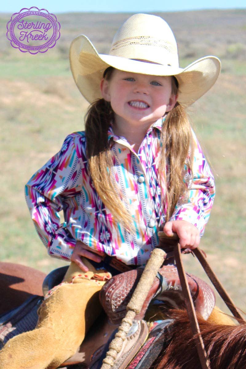 Let your kiddo blaze their own Chisolm Trail in this stylish, button-up! Featuring four brave hues - pink, purple, ivory, and turquoise - your little one is sure to be the trailblazer in town! Get 'em lookin' sharp without even breaking a sweat! Yee-haw!