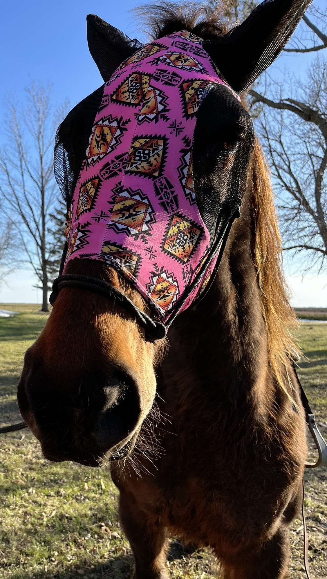 Tacktical brand Pink Sedona fly mask. Perfect protection for those pesky flies and mosquitos along with protection from UV Rays. Made to conform to your horses head without the need for irritating velcro or buckles. Mesh material on eyes and ears does not block vision.